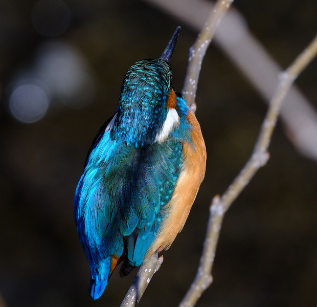 カワセミ3 BORG50FL+絞りM57(約45mmに絞る)+FUJI X-Pro1ボデー ISO1600 1/210秒 トリミング 半手持ち撮影 撮影:中川昇 カワセミの背中にピントを合わせました。羽根の先端の方はボケています。