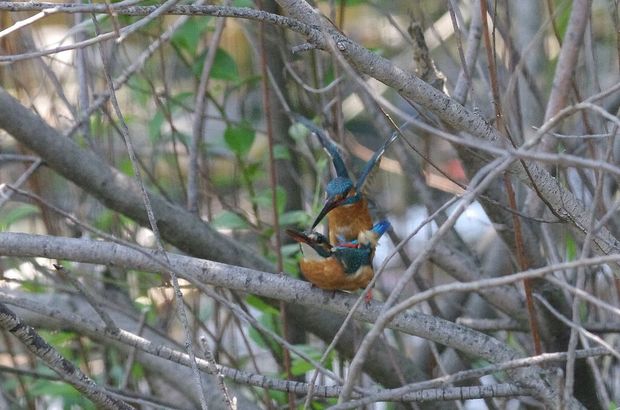 求愛給餌の瞬間です。左のオスから右のメスに渡します。これもほんの一瞬なので反射神経が要求されますが、笠井さんは見事に捉えています。今の季節は恋の季節なので、運が良ければこういう場面に遭遇する可能性があります。