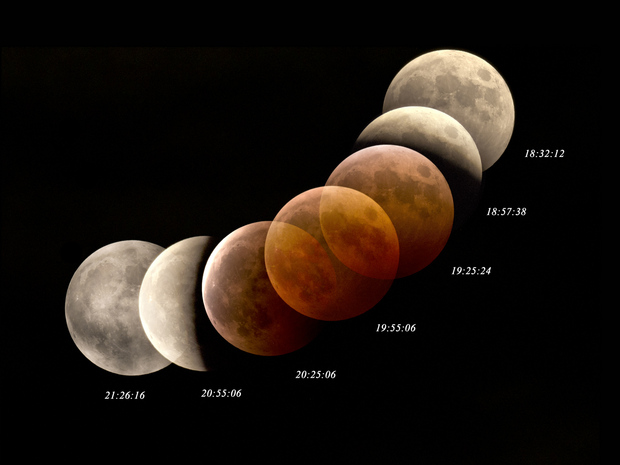 タイトル:皆既月食の変化 撮影日:2014年10月8日19時00分、19時19分、19時28分、19時52分、20時13分、20時24分、20時39分、20時54分 撮影場所:大阪府 BORG77EDII+ビクセンNLV25mm+ソニーDSC-RX100 コリメート法 赤道儀:高橋製作所P-2赤道儀 画像処理:Photoshop elementsでトリミング他 撮影者:S.I.様