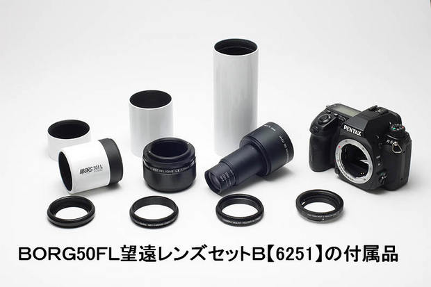 ⇒というわけで、何と50FLSWセットはデジボーグ50FL望遠レンズセットA【6250】がベースになっています。+4万円で残りのパーツ全てが手に入ります。どうです?これはお買い得でしょう?月のクレーターや土星の輪が見られるアイピース2個付、上方の天体が見やすくなる天頂プリズム付、天体や野鳥の追尾に便利な微動雲台付、鏡筒バンド付と見る撮るに必要なパーツが勢ぞろい。他のボーグにも流用できるから、実はすごくお得なのです。![]()