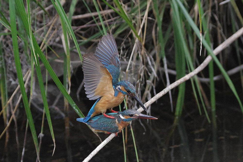 私のカワセミ給餌と交尾の画像の撮影位置を紹介しますと、給餌は2羽が止まって 給餌する枝に対して直角位置(左右のカワセミの正面側)から撮影し、交尾は雌が止まっている枝が突き出した方向(カワセミの真横側)から狙うと格好も良い解像度が撮れた画像が撮影できます。BORGレンズでカワセミ置きピン撮影は常に被写界深度を意識して撮影位置 を選ぶことが重要ですが、今回の場所は川へ護岸から突き出た枝で給餌や交尾をするので給餌の撮影位置を2羽が左右に見える場所を選ぶと、どうしても離れた 枝被りしない位置は上下流へ離れた護岸から撮影しなくてはなりません。 その点BORGレンズの高解像度を利用しレンズの中心から70%位の範囲に 入ればトリミングで充分な画質の画像が得られます。 この時2羽のカワセミのフォーカスは雌が待っている時にどの方向を向いて いても赤い足を狙ってEV拡大機能で足から前側にフォーカスを合わせるのが コツです。こうして雄が魚を咥えて飛んできたら連写すればOKです。 交尾は枝先から狙えば真横位置になるので向いている嘴から前側にフォーカス を事前に合わて鳴き声を頼りに撮影すれば撮影が出来ます。