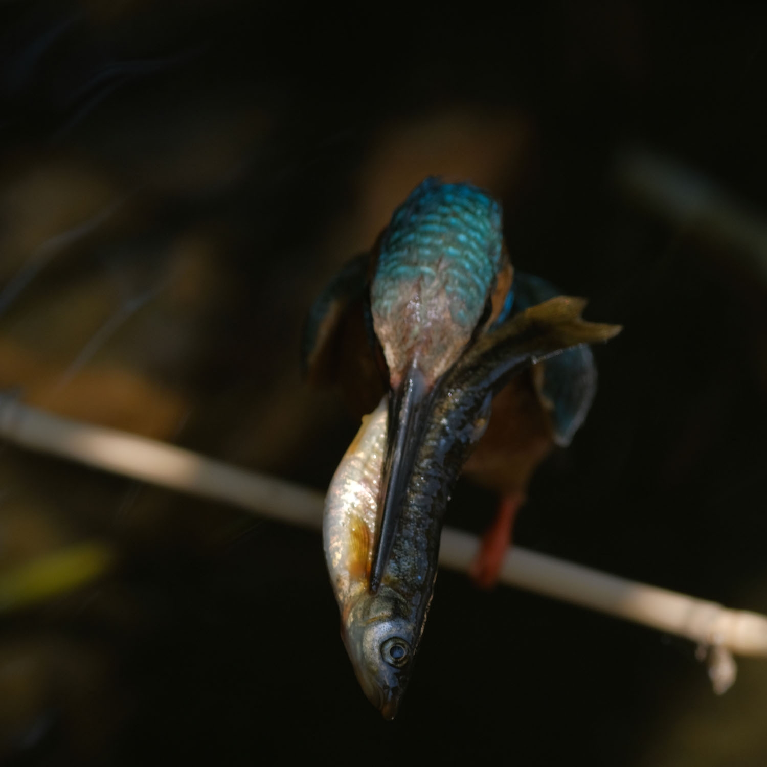 給餌3:この画像のポイントは給餌の瞬間を捉えたことはもちろんですが、餌の魚の質感や背景の美しいボケ味にも注目です。