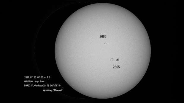 体調のこともあり8月の日食ツアーは断念し、その費用でBORG90FLとQHYを購入しました。当初71FLとQHYで月、土星、木星等で拡大撮影の練習をしておりましたが、7月8日から黒点2665が久しぶりに大きく発達し、数年71FL+E-PL1での撮影を続けてきましたが、初めて黒点の拡大撮影に挑戦し、試行錯誤しながらも何とか西端に隠れるまでの追跡が出来ました。