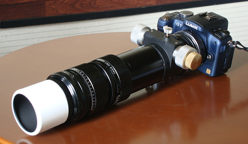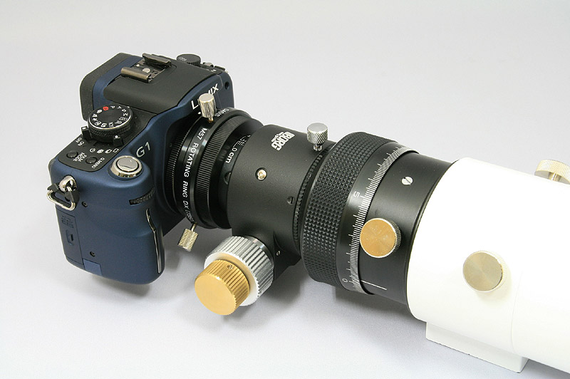 待望のボーグ用ミニマイクロフォーカス接眼部登場。![]() ●品名:ミニマイクロフォーカス接眼部(MMF-1)●品番:【9857】 ●発売日:4月17日(金)主要な販売店に入荷予定 ●接続:望遠鏡側M57P0.75オス、接眼側M42P0.75オス(【7528】併用でM57接続) ●減速比:1/10 ●接眼部のストローク:40mm ●回転装置付(M57側) ●光路長:66ミリ(31.7接眼部付)、50mm(【7528】併用) ●付属品:31.7接眼部、調整用6角レンチ(3mm) ●重量:450g ●台湾製 ●初回ロット:100台 ●ご注文は販売店へお願いします。 ●現物は協栄産業東京店でご覧になれます。 <MMF-1の特長> ●天体用にも野鳥用にも最適な粗動と微動付の非常に操作性の良い、精度の高い接眼部です。 ●眼視用としても撮影用としても深い満足が得られる高品質な製品です。 ●ガタやバックラッシュが無く、重いカメラやアクセサリーを装着しても動きが渋くなることがありません。 ●接眼部が全てネジ込みで接続できるために、カメラや天頂プリズム等の落下の心配がなく、機材の移動時にも安心です。 ●ミニボーグ50に装着してもケラレはありません。デザイン的にもミニボーグにはベストマッチングです。 ●ミニボーグの場合は、MMF-1を鏡筒の中心付近に配置するレイアウトも可能です。 ●M57接続なので汎用性が高く、変換アダプター併用で他社製の望遠鏡にも接続が可能です。 ●80φ金属鏡筒にも使用可能。ヘリコイドMの後方に接続すれば、ヘリコイド+MMF-1の両刀使いになります。 ●BORG125SDの眼視ユニットNや80φ金属鏡筒のドロチューブの後方にも【7507】併用で装着可能。 ただし、【7507】とネジCの干渉を防ぐために【7602】等を併用ください。 ●ネジBを調整することにより、重いカメラを装着した状態でネジAを緩めても、自然にズリ下がることはありません。 ●ローラーとベアリングが当たる面にはプレートを装備。耐久性の向上を図っています。 ●減速微動装置だけでも2万円以上で市販されている中、これだけの品質と機能で3万円台に抑えました。 ●7月22日の皆既日食用にも最適。重いビデオカメラも余裕で搭載できます。 ●合焦ノブBは、非常に軽い力で回りますので、合焦時のブレが最小になり、快適なピント合わせが可能です。 ●US.PAT取得済 <使い方のコツ・注意点> ●一眼レフカメラの装着は【7528】+【7000】+【50△△】の組み合わせが推奨ですが、他社製のTリングを使用する方法もあります。ただし、1.4倍テレコンバーターDG【7214】併用時は、必ず【7528】と【7604】を併用ください。 【7604】が無いと、テレコンバーターの先端部が接眼部と干渉してしまい装着が出来ません。(下記画像参照) ●接眼部の合焦ノブの位置をカメラに対して相対的に変えるには、M57回転装置DX【7352】をご使用ください。合焦ノブ2をカメラの背面から見て左側に位置させると、手持ち撮影時に左手で2を回せるので非常に便利です。 ●ドロチューブの内径が37mmなので、フルサイズのカメラを装着すると四隅がけられます。APS-Cやフォーサーズ、マイクロフォーサーズは問題ありません。 ●合焦ノブを上側に持ってくると、下側に持ってくるよりも若干フォーカスがよりスムーズになります。 ![]() <MMF-1の使い方> MMF-1はギヤを全く用いず、ローラーとベアリングの摩擦のみによってドローチューブを前後させる方式の合焦装置です。ガタやバックラッシュが無く、極めてスムーズな合焦タッチを得るために、以下に述べる合焦ノブ1&2、及び4つのネジ(A・B・C・D)の正しい使い方をご確認下さい。 <合焦ノブ1&2>:1は減速装置の無い粗動ノブで、アイピースを替えた時など素早い合焦操作が必要な際に用います。2は1の1/10のスピードでドローチューブを前後させる減速装置が備わっており、非常に細かいピント出しができます。常に1→2の順で使うことにより、速い合焦スピードと精密なピント合わせを両立させることが可能です。 <ネジA>:合焦ハンドルからドローチューブを切り離して動きを止め、ドローチューブを圧迫固定するストッパーネジ。このネジを締めるとドローチューブは固定され、合焦ハンドルはカラ回りする状態になります。写真撮影時など、特にドローチューブの固定が必要な場合に便利です。 <ネジB>:左右合焦ノブの中央部にあるM6セットスクリュー。合焦ハンドルとドローチューブとの圧着具合を加減するネジで、これを締めたり緩めたりすることにより合焦タッチの強弱の微調整が可能となります。(出荷時に予め調整されていますので、通常は調整の必要はありません。長期の使用でドローチューブが緩んでスリップするようになってきた場合や、特に重いアクセサリー類を装着する場合は付属の3ミリの六角レンチで適宜締め込んで下さい。) <ネジC>:接眼部の回転角を調整するストッパーネジ。このネジと周りのマイナスネジ3箇所を緩めると接眼部が360゜回転しますので、撮影や観測に都合の良い角度まで回した状態でこのネジをしっかり締めて下さい。出荷時は全ネジを強く締め付けています。 <ネジD>使用し