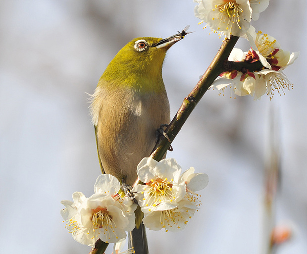 梅の花の蜜を吸っていると思いきや虫を食べていました。