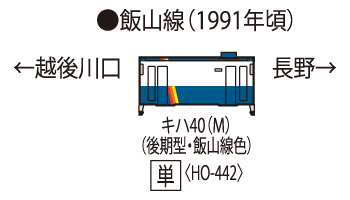 両運転台寒地向けのキハ40-500形で飯山線で運用された車両は、白と青にオレンジ系のストライプが入った姿となっていました。