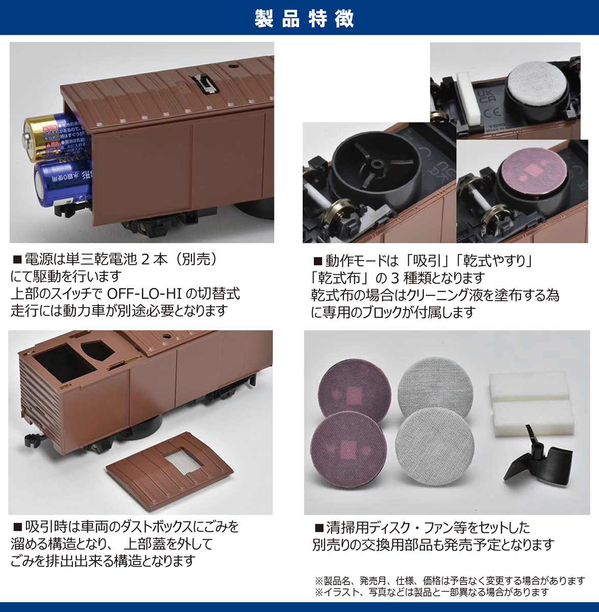 ●乾電池による駆動で、機関車などの動力車と連結させ線路上を走行させることでクリーニングカー自体はレールの状態や給電方式の影響を受けないクリーニングが可能