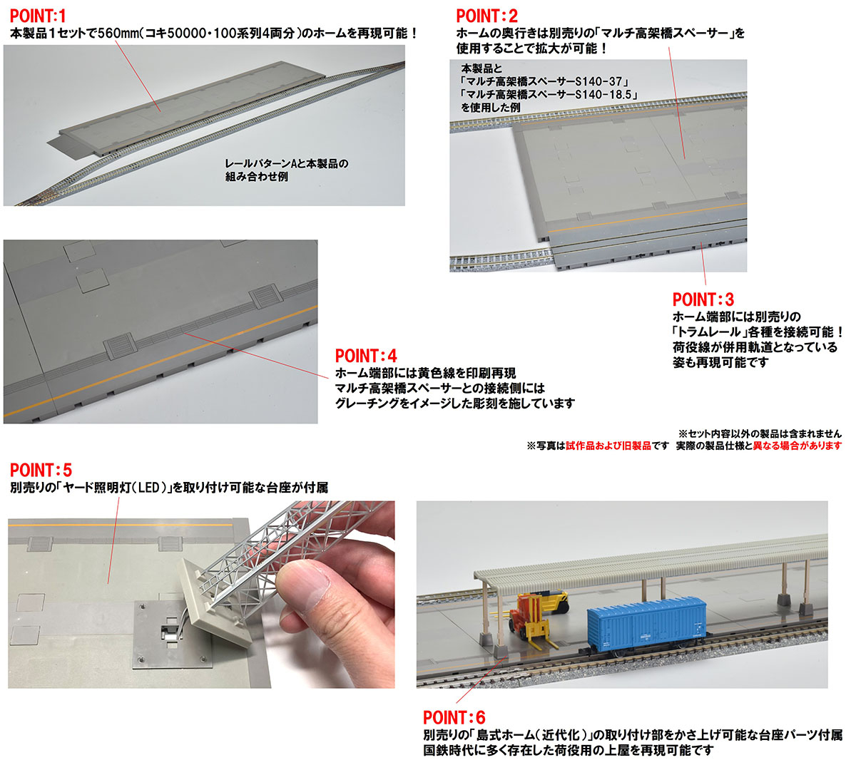 ●別売りの<4010>島式ホーム近代型などのホーム屋根に使用可能な脚部かさ上げ部品を収録、国鉄時代の貨物駅によく見られた荷役用の上屋を再現可能