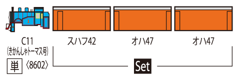 C11-227号をベースとしてトーマス号となり、主にオレンジ色の客車7両をけん引し運行しています。