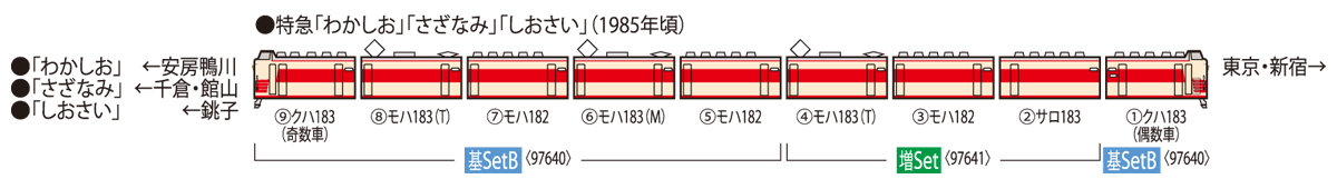 幕張電車区の183系は1985年には一部編成が6両モノクラスの編成へと変更され、また多客期には貫通扉を使用した9両編成への増結が行われるようになりました。この編成組み換えの際、6両編成の先頭車をクハ183形0番代に限定したほか、183系1000番代の中間車の多数を「あずさ」増発を目的として長野・松本運転所に転出したため先頭車が1500番代、中間車が0番代の編成が組成されました。
