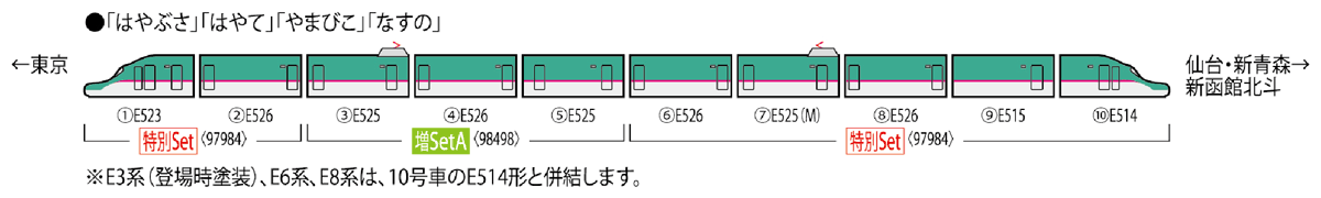●本製品(1・2・6・7・8・9・10号車)と品番98498の増結Aを組み合わせて10両フル編成が再現可能