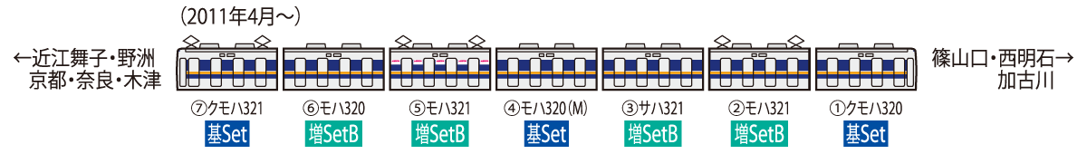 2011年4月よりJR西日本の京阪神地区において終日女性専用車の設定が施行され、321系は5号車モハ321が女性専用車となりました。