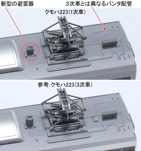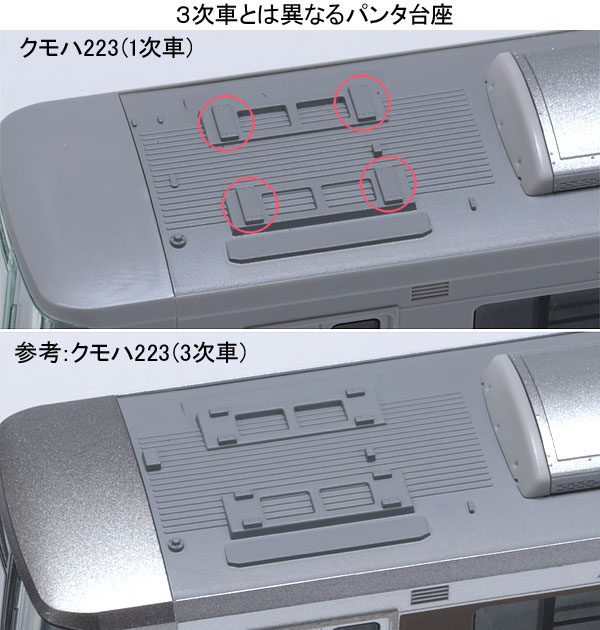 クモハ223、モハ222・223形の屋根のパンタグラフ台座は3次車とは異なる姿を再現しています。